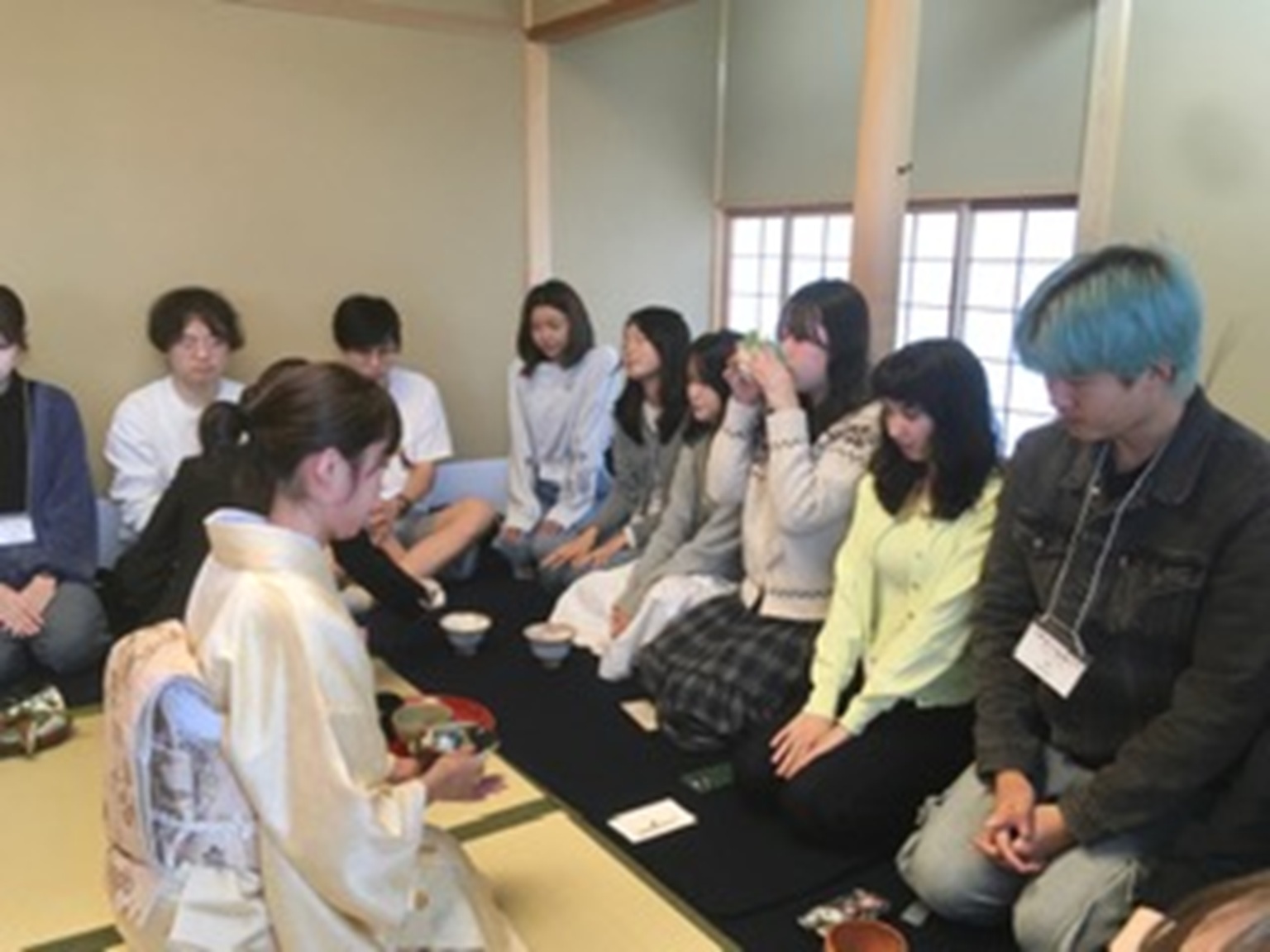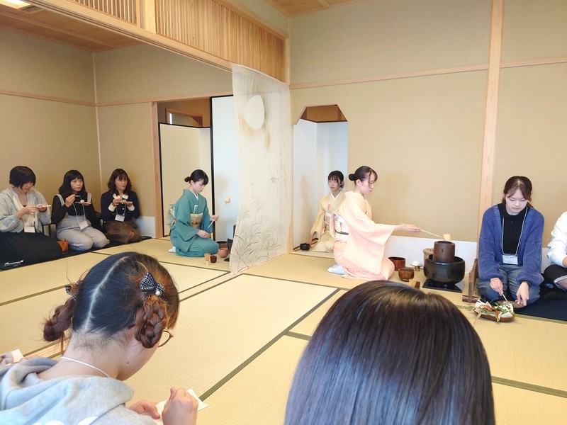 18階 天空の茶室「正庵」で緊張しつつもお茶席を楽しんだあとは、教室に移動し交流会に参加。交流会では、自己紹介や出身国のおすすめ観光スポットや料理などを紹介しあったり、グループワークゲームをしたりしながら親交を深めていました。