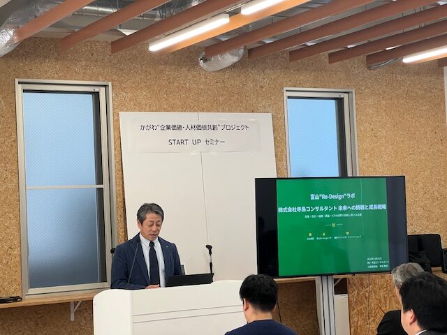 次に、富山県での先行事例である「富山“Re-Design”ラボ」に、2024年と2025年に参加している株式会社寺島コンサルタントの寺島代表取締役社長から富山大学協力研究員との経営改善の実施や企業の参加メリットなどについて説明がありました。