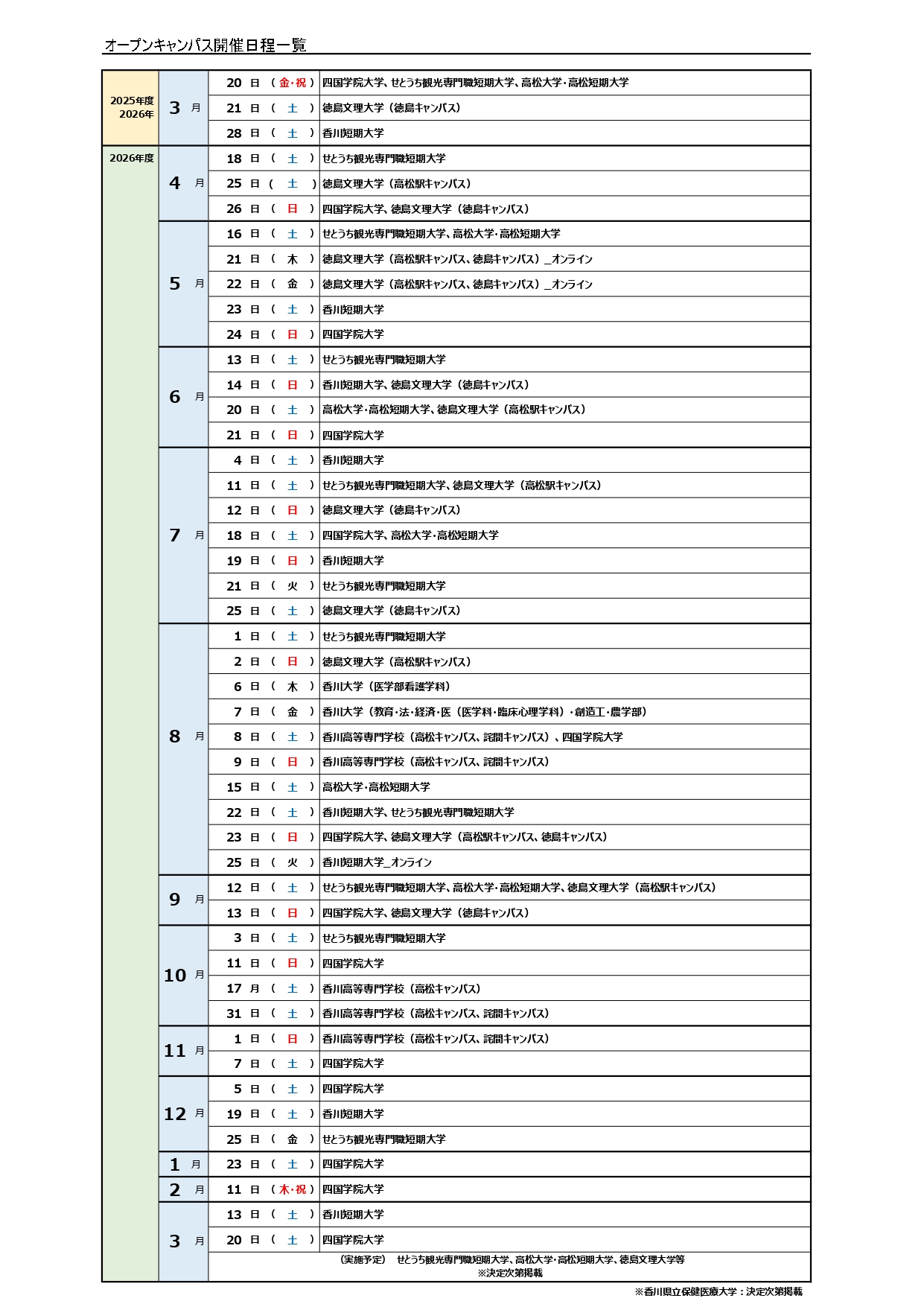 2026年 8月 8日(土):高松キャンパス、詫間キャンパス