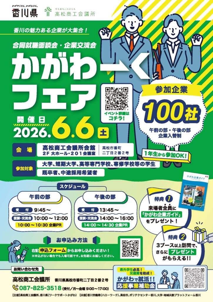 香川県と高松商工会議所は、学生や中途採用希望者など香川県内での就職を希望する方を対象に、香川県内の魅力ある企業と直接面談・交流ができる就職イベント「かがわーくフェア(合同就職面談会・企業交流会)」を開催します。ぜひご参加ください。